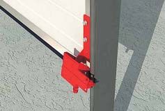 Устройство защиты от разрыва троса устанавливается на полотно ворот вместо нижнего углового кронштейна. В устройстве имеется острый клин. Трос закрепляется к устройству таким образом, что когда он натянут, клин отжат от угловой стойки и ворота свободно опускаются и поднимаются. При обрыве, натяжение троса ослабевает и клин врезается в угловую стойку, что приводит к остановке ворот.